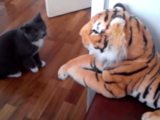 Dal canto suo, il tigrotto in peluche se ne sta calmo calmo, seduto sul tavolo, mentre il gatto, tra zampate, graffi e soffi, si fa sempre più minaccioso. Dopo qualche minuto, il micio soddisfatto del suo attacco, guarda il suo nemico sconfitto, sicuro di avergli inflitto una bella lezione che non dimenticherà.