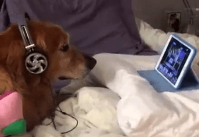 Risultato? Incredibilmente il cane è rimasto assorto dal filmato e grazie alle cuffie non ha sentito i boati all’esterno.