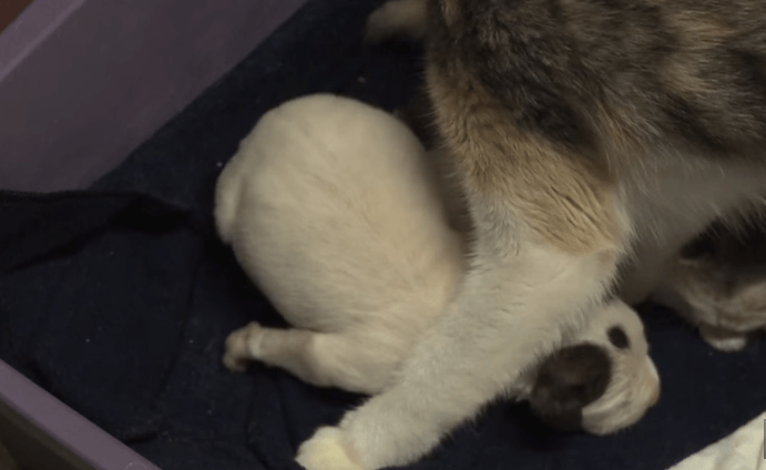 Infatti, per aiutare quella dolce creatura in pericolo, i veterinari della Cleveland Animal Protective League hanno tentato d’inserire il cagnolino in una nidiata di gatti. I veterinari hanno raccontato come il risultato di questo tentativo sia stato meraviglioso, stupendosi della reazione della mamma gatta che ha subito iniziato a prendersi cura del cagnolino, dandogli una seconda opportunità per continuare a vivere.