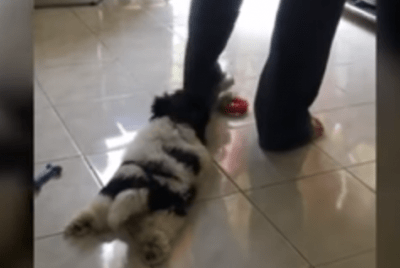 Nel filmato di pochi secondi, si vede l’adorabile cane che si fa trascinare sul pavimento, restando attaccato ai pantaloni del padrone che si dirige verso le valige.