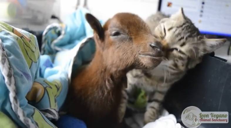 In questo caso i protagonisti sono un gatto e una capretta salvati dal Leon Vegano Animal Sanctuary, in Spagna.