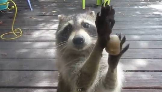 Rocksy è stato filmato in una delle sue solite comparse alla porta finestra dell’abitazione di una signora amante degli animali, alla quale chiede sempre del buon cibo. La cosa che sorprende è che Rocksy si è ingegnato per farsi notare e far il più possibile del rumore: bussando al vetro con una piccola pietra che tiene tra le sue zampe anteriori, riesce in questo modo ad attirare l’attenzione della sua benefattrice!