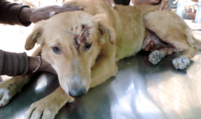 Il cane aveva riportato diverse ferite e non riusciva più ad alzarsi dal punto in cui lo hanno trovato i volontari. Inizialmente sembrava che il randagio fosse lievemente ferito alla testa e che avesse riportato solo qualche escoriazioni alle zampe. Ma quando i volontari si sono avvicinati hanno scoperto che ad un arto posteriore il randagio presentava una ferita grave e profonda.