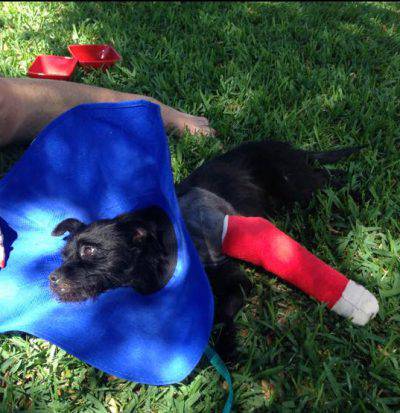 Il terrier tutto nero chiamato Jake ha riportato una brutta frattura e la lussazione ad un arto per cui è stato necessario un intervento chirurgico. Tuttavia, sottolineano i volontari, la frattura scomposta richiederà più tempo e forse anche un altro intervento. Per poter provvedere alle spese veterinarie è stata avviata una raccolta fondi e nel giro di pochi giorni sono arrivate numerose donazioni.