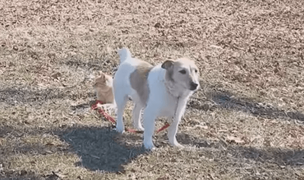 Quando un gatto si mette in testa qualcosa è molto difficile fargli cambiare idea: un desiderio sadico oppure un piacere “malefico” con il quale ama “torturare” le sue vittime. In questo caso, un meticcio di taglia medio piccola, un po’ anziano, scopre quanto siano dispettosi i suoi cugini felini. Il cane è in giardino con un altro esemplare per una passeggiatina. Entrambi si trascinano il guinzaglio ma il meticcio anziano non può muoversi a suo piacere, in quanto dietro di lui, un bel gatto rosso si diverte a reggere il guinzaglio. Il povero cane tira delicatamente per allontanarsi, ma il micio dispettoso non demorde e così l’anziano meticcio desiste e finisce per sedersi, in attesa che qualcuno lo venga a salvare!