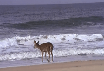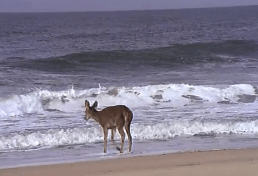 Si tratta di un momento molto raro, immortalato, nelle Lande in Francia, nel 1993, da un reporter Anthony Martin che stava realizzando un documentario naturalista intitolato “Le4 stagioni del cervo”. Nel filmato si vede un daino che si diverte sulla spiaggia e con le onde del mare.