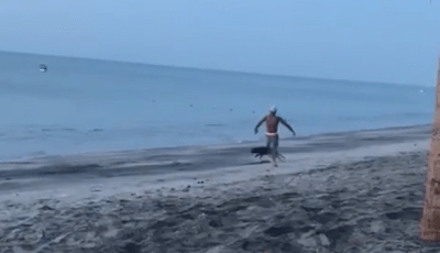 Il giovane corre in direzione del cane e al momento di sferrargli un calcio scivola sulla sabbia cadendo a terra. In una frazione di secondo, il cane si accorge di tutto e spaventato si allontana di fretta mentre a dargli manforte, sopraggiunge un branco di cani che non ha per nulla l’intenzione di farla passare liscia al giovane che ha cercato d’infastidire e di fare del male ad uno dei suoi componenti.