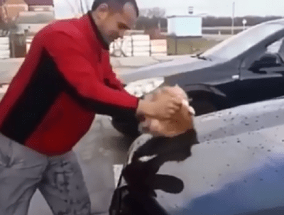 Nel filmato si vede chiaramente il povero animale terrorizzato, rannicchiato su se stesso, nelle mani di quell’uomo. Non contento della punizione, per completare il quadretto degli orrori, l’individuo inzuppa il gatto in un secchio dove probabilmente vi è il sapone liquido per pulire la carrozzeria. Poi struscia il felino randagio come un panno sulla superficie dell’automobile. Il gatto impaurito miagola come per implorare pietà e chiedere aiuto.